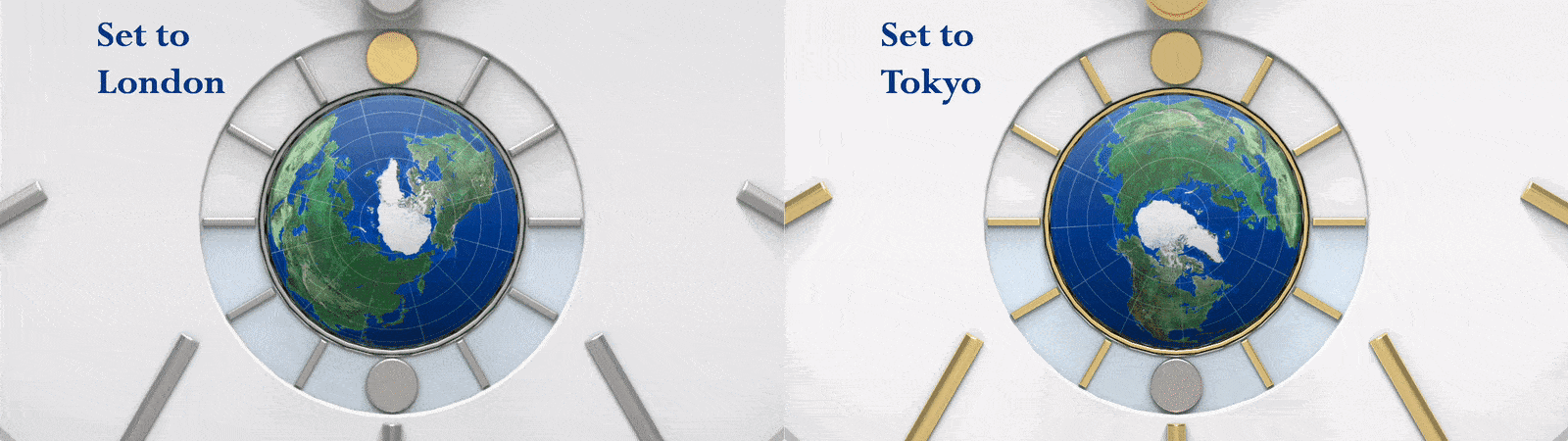 The 24-hour subdial has raised markers displaying 2-hour increments. A subtle shaded area on the bottom half shows the portion of the Earth’s rotation that is cloaked in nighttime. Marking midnight is a silver medallion representing the Moon, while a gold medallion represents the Sun.